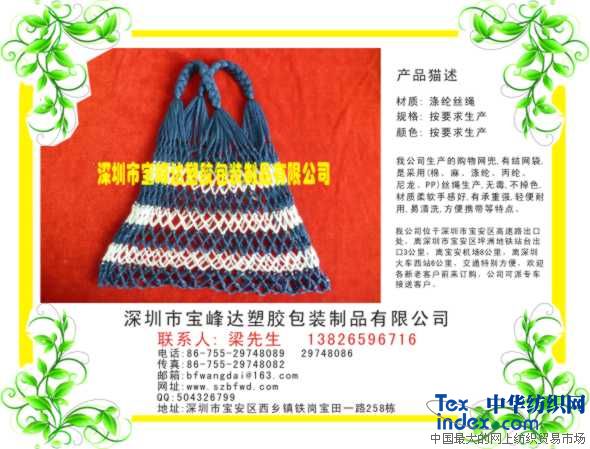 購(gòu)物網(wǎng)兜,有結(jié)網(wǎng)袋,材料是采用:(滌綸繩,尼龍繩,丙綸繩, PP繩, 等…絲繩生產(chǎn)),無(wú)毒,不掉色,材質(zhì)柔軟手感好,有承重強(qiáng),輕便耐用,易清洗,方便攜帶等特點(diǎn)。