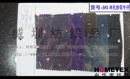 幅寬:150cm 品名:滌棉牛仔 密度:64*47 貨號:B45沖孔炒花 重量:* 具體用途:休閑服、工作服、褲裝、時裝 別名:B45沖孔炒花 成分及含量:65%棉,35%滌 主要用途:服裝用布 ======================================================================= 以上產(chǎn)品全部現(xiàn)貨供應(yīng),可隨時提供樣布卡和現(xiàn)貨,隨時發(fā)貨。所有產(chǎn)品全部是廠家直銷價,我們承諾:以超低利潤營銷,我 們只求銷售量。為保證您的利益,我司建議您在采購前先確認(rèn)我們的品質(zhì)樣與顏色樣后再拿大貨,期待與您的真誠合作。因產(chǎn) 品種類較多,具體參考未盡詳盡,如有需要,請您與我們聯(lián)系。 瑞豐紡織(中大旗艦店)坐落于國內(nèi)最大的紡織面料產(chǎn)業(yè)中心—廣州中大,是一家專業(yè)銷售面料的廠家直銷商。主要經(jīng) 營產(chǎn)品有:全棉凈色、仿記憶絲面料、全棉(TC)色織等,面料品種花達(dá)上千余種,所有產(chǎn)品全部現(xiàn)貨經(jīng)營。 我們面料的品質(zhì)來源于:1、采用國內(nèi)外優(yōu)質(zhì)的原材料;2、使用精良的生產(chǎn)工藝和設(shè)備;3、完善的生產(chǎn)質(zhì)量管理體系。我 們具有開發(fā)和創(chuàng)新品種的強(qiáng)烈意識和優(yōu)越條件,并根據(jù)客戶需求與市場變化時時推出潮流面料。憑著多年的專業(yè)行業(yè)經(jīng)驗(yàn),根 據(jù)客戶需求,不論客戶在全國任何地方,只要提供小樣,就可在一兩天時間內(nèi)輕松獲得所需面料的信息。 批發(fā)說明供應(yīng)商支持混批 。 ============================================================= 有意請加QQ:1295021910或電話聯(lián)系。 公司名稱:威圳紡織品廠 聯(lián)系人:陳修喜先生 手機(jī):13650817858 網(wǎng)址:http://www.gzweizhen2010.cn.alibaba.com =============================================================