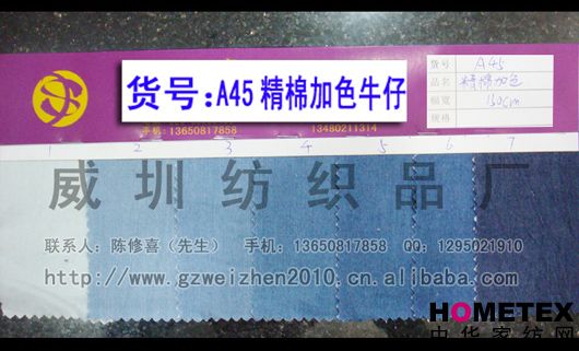 織物組織:平紋 幅寬:150cm 品名:純棉牛仔 密度:64*47 水洗工藝:砂洗 貨號:A45精棉加色 重量:* 具體用途:休閑服、工作服、褲裝、時裝 別名:A45精棉加色 印染工藝:印花 成分及含量:100%棉 主要用途:服裝用布 ======================================================================= 以上產(chǎn)品全部現(xiàn)貨供應(yīng),可隨時提供樣布卡和現(xiàn)貨,隨時發(fā)貨。所有產(chǎn)品全部是廠家直銷價,我們承諾:以超低利潤營銷,我 們只求銷售量。為保證您的利益,我司建議您在采購前先確認(rèn)我們的品質(zhì)樣與顏色樣后再拿大貨,期待與您的真誠合作。因產(chǎn) 品種類較多,具體參考未盡詳盡,如有需要,請您與我們聯(lián)系。 瑞豐紡織(中大旗艦店)坐落于國內(nèi)最大的紡織面料產(chǎn)業(yè)中心—廣州中大,是一家專業(yè)銷售面料的廠家直銷商。主要經(jīng) 營產(chǎn)品有:全棉凈色、仿記憶絲面料、全棉(TC)色織等,面料品種花達(dá)上千余種,所有產(chǎn)品全部現(xiàn)貨經(jīng)營。 我們面料的品質(zhì)來源于:1、采用國內(nèi)外優(yōu)質(zhì)的原材料;2、使用精良的生產(chǎn)工藝和設(shè)備;3、完善的生產(chǎn)質(zhì)量管理體系。我 們具有開發(fā)和創(chuàng)新品種的強(qiáng)烈意識和優(yōu)越條件,并根據(jù)客戶需求與市場變化時時推出潮流面料。憑著多年的專業(yè)行業(yè)經(jīng)驗(yàn),根 據(jù)客戶需求,不論客戶在全國任何地方,只要提供小樣,就可在一兩天時間內(nèi)輕松獲得所需面料的信息。 批發(fā)說明供應(yīng)商支持混批 。 ============================================================= 有意請加QQ:1295021910或電話聯(lián)系。 公司名稱:威圳紡織品廠 聯(lián)系人:陳修喜先生 手機(jī):13650817858 網(wǎng)址:http://www.gzweizhen2010.cn.alibaba.com =============================================================