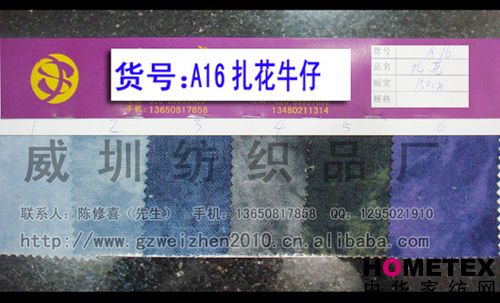 織物組織:平紋 幅寬:150cm 品名:滌棉牛仔 密度:64*47 水洗工藝:砂洗 貨號:A16扎花 重量:* 具體用途:休閑服、工作服、褲裝、時裝 別名:A16扎花 印染工藝:印花 成分及含量:75%棉,25%滌 主要用途:服裝用布 ======================================================================= 以上產品全部現貨供應,可隨時提供樣布卡和現貨,隨時發(fā)貨。所有產品全部是廠家直銷價,我們承諾:以超低利潤營銷,我 們只求銷售量。為保證您的利益,我司建議您在采購前先確認我們的品質樣與顏色樣后再拿大貨,期待與您的真誠合作。因產 品種類較多,具體參考未盡詳盡,如有需要,請您與我們聯系。 瑞豐紡織(中大旗艦店)坐落于國內最大的紡織面料產業(yè)中心—廣州中大,是一家專業(yè)銷售面料的廠家直銷商。主要經 營產品有:全棉凈色、仿記憶絲面料、全棉(TC)色織等,面料品種花達上千余種,所有產品全部現貨經營。 我們面料的品質來源于:1、采用國內外優(yōu)質的原材料;2、使用精良的生產工藝和設備;3、完善的生產質量管理體系。我 們具有開發(fā)和創(chuàng)新品種的強烈意識和優(yōu)越條件,并根據客戶需求與市場變化時時推出潮流面料。憑著多年的專業(yè)行業(yè)經驗,根 據客戶需求,不論客戶在全國任何地方,只要提供小樣,就可在一兩天時間內輕松獲得所需面料的信息。 批發(fā)說明供應商支持混批 。 ============================================================= 有意請加QQ:1295021910或電話聯系。 公司名稱:威圳紡織品廠 聯系人:陳修喜先生 手機:13650817858 網址:http://www.gzweizhen2010.cn.alibaba.com =============================================================