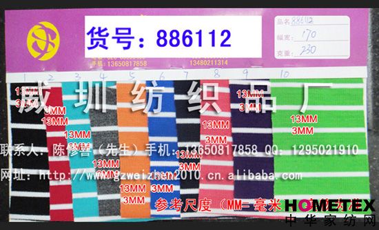 織物組織:色織 幅寬:170 密度:240T 貨號(hào):886112 具體用途:襯衫、休閑服、褲裝、內(nèi)衣、睡衣 別名:886112 成分及含量:滌棉 主要用途:服裝用布 紗支:32 ============================================================= 以上產(chǎn)品全部現(xiàn)貨供應(yīng),可隨時(shí)提供樣布卡和現(xiàn)貨,隨時(shí)發(fā)貨。所有產(chǎn)品全部是廠家直銷價(jià),我們承諾:以超低利潤(rùn)營(yíng)銷,我們只求銷售量。為保證您的利益,我司建議您在采購(gòu)前先確認(rèn)我們的品質(zhì)樣與顏色樣后再拿大貨,期待與您的真誠(chéng)合作。因產(chǎn)品種類較多,具體參考未盡詳盡,如有需要,請(qǐng)您與我們聯(lián)系。 瑞豐紡織(中大旗艦店)坐落于國(guó)內(nèi)最大的紡織面料產(chǎn)業(yè)中心—廣州中大,是一家專業(yè)銷售面料的廠家直銷商。主要經(jīng)營(yíng)產(chǎn)品有:全棉凈色、仿記憶絲面料、全棉(TC)色織等,面料品種花達(dá)上千余種,所有產(chǎn)品全部現(xiàn)貨經(jīng)營(yíng)。 我們面料的品質(zhì)來(lái)源于:1、采用國(guó)內(nèi)外優(yōu)質(zhì)的原材料;2、使用精良的生產(chǎn)工藝和設(shè)備;3、完善的生產(chǎn)質(zhì)量管理體系。我們具有開發(fā)和創(chuàng)新品種的強(qiáng)烈意識(shí)和優(yōu)越條件,并根據(jù)客戶需求與市場(chǎng)變化時(shí)時(shí)推出潮流面料。憑著多年的專業(yè)行業(yè)經(jīng)驗(yàn),根據(jù)客戶需求,不論客戶在全國(guó)任何地方,只要提供小樣,就可在一兩天時(shí)間內(nèi)輕松獲得所需面料的信息。 批發(fā)說(shuō)明供應(yīng)商支持混批 。 ============================================================= 有意請(qǐng)加QQ:1295021910或電話聯(lián)系。 公司名稱:威圳紡織品廠 聯(lián)系人:陳修喜先生 手機(jī):13650817858 網(wǎng)址:http://www.gzweizhen2010.cn.alibaba.com =============================================================