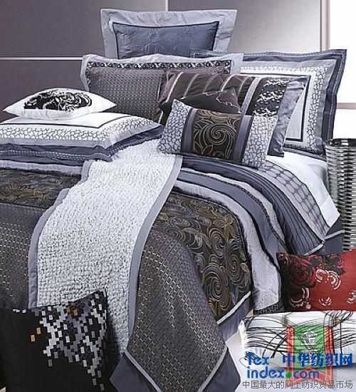 此款設(shè)計(jì)采用、體現(xiàn)了傳統(tǒng)與浪漫、古典與現(xiàn)代相融合的手法與風(fēng)格,緊扣主題。圖案母題選擇了變形的傳統(tǒng)卷草紋樣與中國(guó)園林木窗花格,作為主設(shè)計(jì)元素。而靠墊上的長(zhǎng)方格及漸變圓點(diǎn)等計(jì)算機(jī)圖形,則突出了現(xiàn)代和時(shí)尚的特點(diǎn),色彩以灰色為主調(diào),妃色、金黃色等作局部對(duì)比,產(chǎn)生了即統(tǒng)一、協(xié)調(diào)又活潑、豐富的藝術(shù)效果。面料采用高檔的提花色織紡織品,一些細(xì)則應(yīng)用先進(jìn)的彈力繡花工藝,更提高了產(chǎn)品的檔次與品位。套件的枕頭、靠墊上有些花形與主圖案的相關(guān)性與系列配套感稍顯不足。