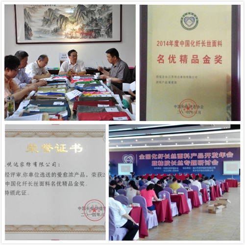 2014-6-23近日,在全國化纖長絲面料產(chǎn)品開發(fā)年會上,悅達(dá)家紡選送的“愛愈濃”新產(chǎn)品,榮獲2014年度中國化纖長絲面料名優(yōu)精品金獎。此次會議共授予仿真類、運(yùn)動休閑類、新型功能類、家紡類、防寒服類等7個類別名優(yōu)精品金獎67個、名優(yōu)精品獎108個、入圍獎42個。悅達(dá)家紡新產(chǎn)品位列全國7個家紡類名優(yōu)精品金獎產(chǎn)品第三位,...[繼續(xù)閱讀] -