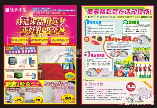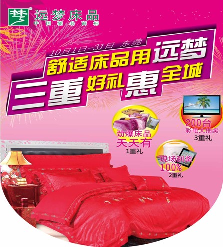 2012-10-10金秋十月,國慶佳節(jié)。遠(yuǎn)夢(mèng)家居與民同慶,回饋消費(fèi)者,特推出“三重好禮惠全程”感恩促銷活動(dòng);顒(dòng)時(shí)間:2012年10月1日至2012年10月31日,活動(dòng)區(qū)域:東莞全城中遠(yuǎn)夢(mèng)賣場(chǎng)及遠(yuǎn)夢(mèng)專賣店。本次活動(dòng)細(xì)則:活動(dòng)一重:勁爆床品天天有賀中秋,慶國慶,遠(yuǎn)夢(mèng)品牌勁爆勢(shì)在必行;顒(dòng)期間,天天推出爆款產(chǎn)品,詳見海報(bào)。...[繼續(xù)閱讀] -